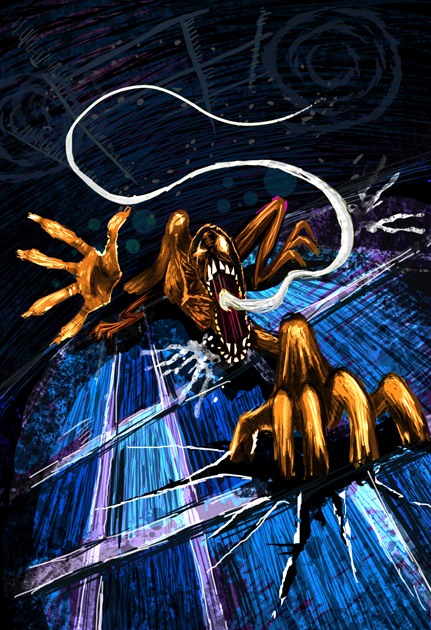 Tengo  una daga arpón en mi cinturón, con dos dedos logro alcanzarla.  La criatura muerde mi hombro, duele,  pero puedo resistirlo. Esta cosa cree que combate contra un ser normal, que me inmovilizaré, se equivoca. Entierro la  daga y enciendo su mecanismo. Mi arma crece y detona dentro de la bestia.